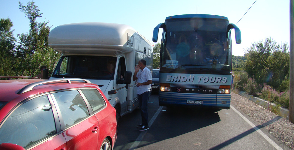Arrivé par la frontière monténégrine, Le passage de la douane est une vraie formalité, sortir tous les papiers, les douaniers font le tour des véhicules avec l'air inquisiteur, puis se détendent et nous échangeons quelques mots sur notre parcours affiché sur les caisses. De l'autre côté des grilles rouillées, quelques hommes en tee-shirt élimés, des enfants faisant la manche. Actuellement début Juillet à mon arrivé en Albanie, le soleil et la chaleur font rage à la frontière, 40 degrés au compteur et très peu de vents, pour couronner le tout un énorme emboutéage ce créer à l'entrée de la frontière, entre camions, bus et voitures. Il faut savoir qu'il y a qu'une seule voie d'entrée dans le pays, une pour rentrer, une pour sortir. Certaines personnes passés sur la voie de droite, celle pour sortir du pays, les esprits s'échauffent entre tous sous la chaleur.